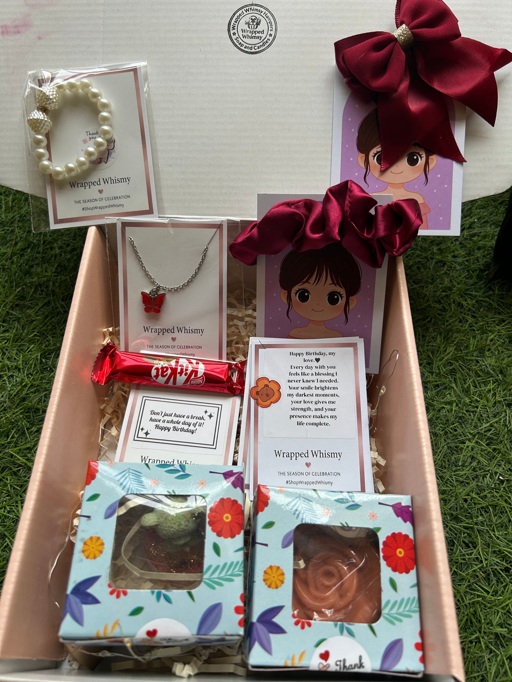 Luxury birthday gift hamper for her with jewelry, scented candles, chocolate, and accessories in a premium gift box. Perfect surprise gift for girlfriend, wife, sister, or best friend.